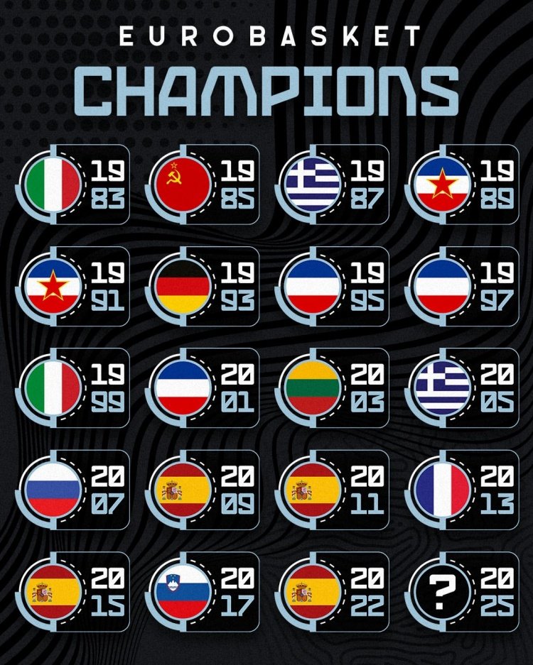 9月11日讯 男篮欧锦赛已经产生了4强,欧锦赛官推晒出了过去19届男篮欧锦赛的夺冠得主,并发问:“哪支球队能创造新的历史?”